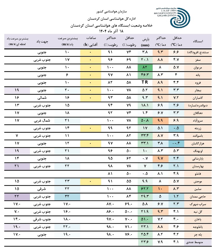 خلاصه وضعیت ایستگاه های هواشناسی استان کردستان در 24 ساعت گذشته؛ تاریخ صدور: سه شنبه 18 آذر ماه 1404