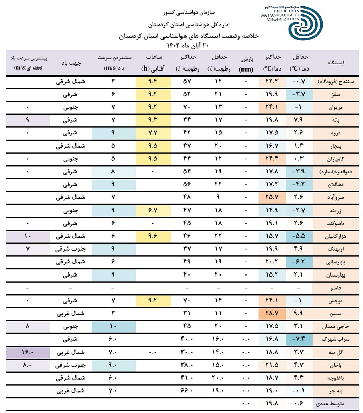 خلاصه وضعیت ایستگاه های هواشناسی استان کردستان در 24 ساعت گذشته؛ تاریخ صدور: سه شنبه 20 آبان ماه 1404
