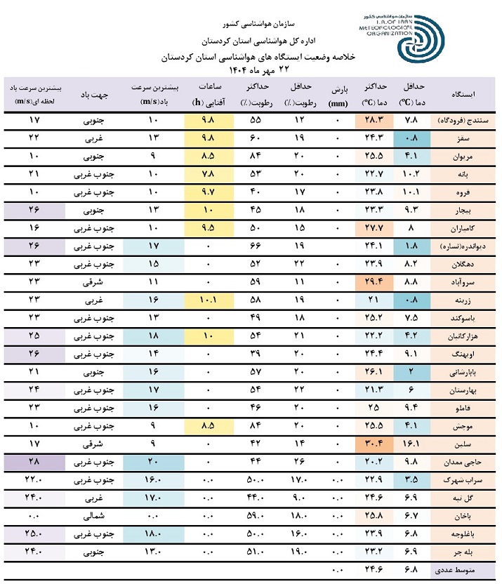 خلاصه وضعیت ایستگاه های هواشناسی استان کردستان در 24 ساعت گذشته؛ تاریخ صدور: سه شنبه 22 مهر ماه 1404