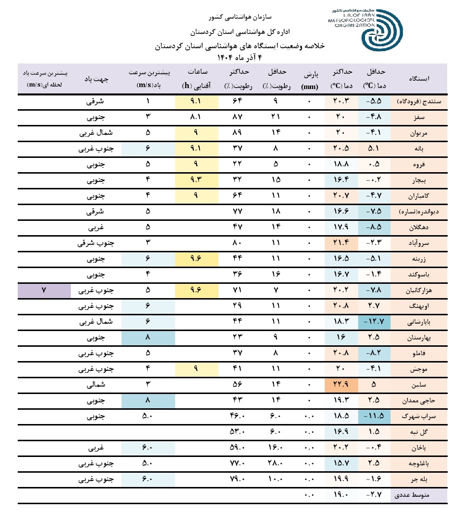 خلاصه وضعیت ایستگاه های هواشناسی استان کردستان در 24 ساعت گذشته؛ تاریخ صدور: سه شنبه 4 آذر ماه 1404