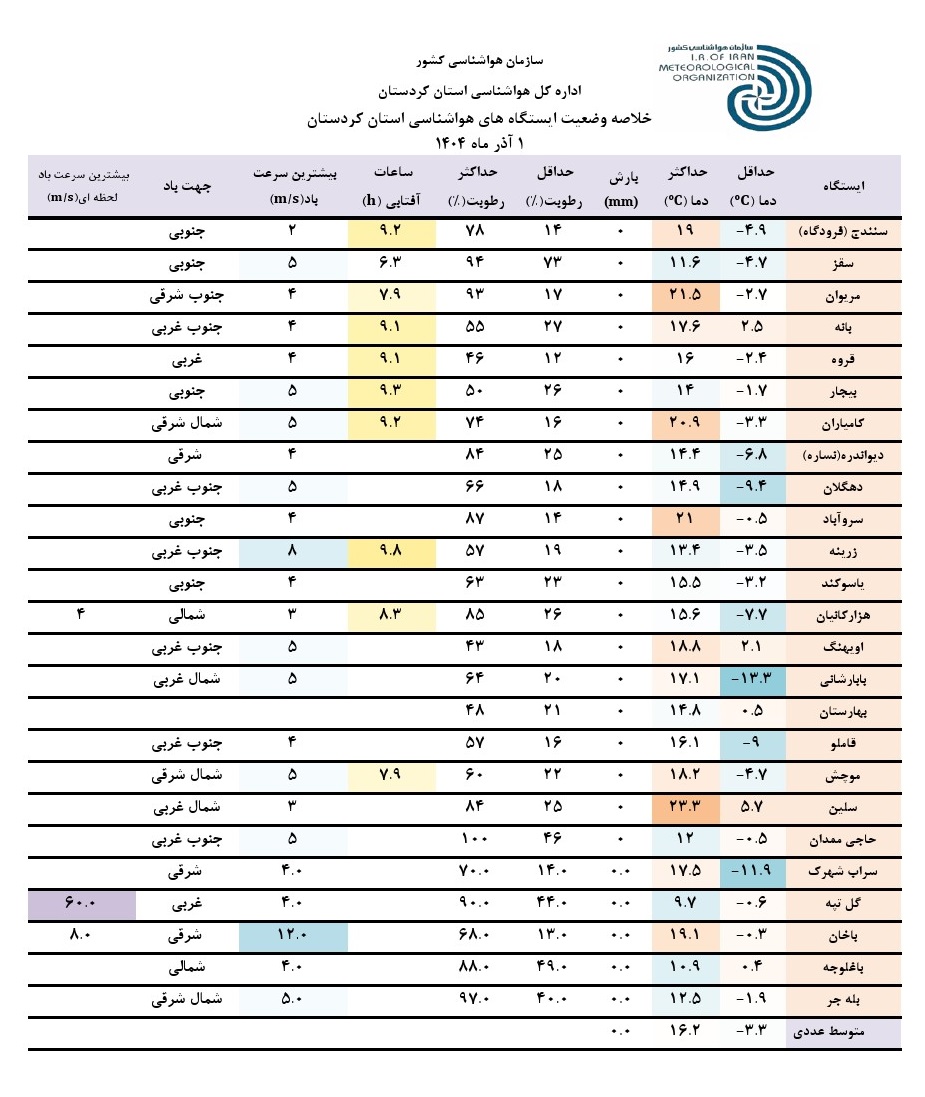 خلاصه وضعیت ایستگاه های هواشناسی استان کردستان در 24 ساعت گذشته؛ تاریخ صدور: شنبه 1 آذر ماه 1404