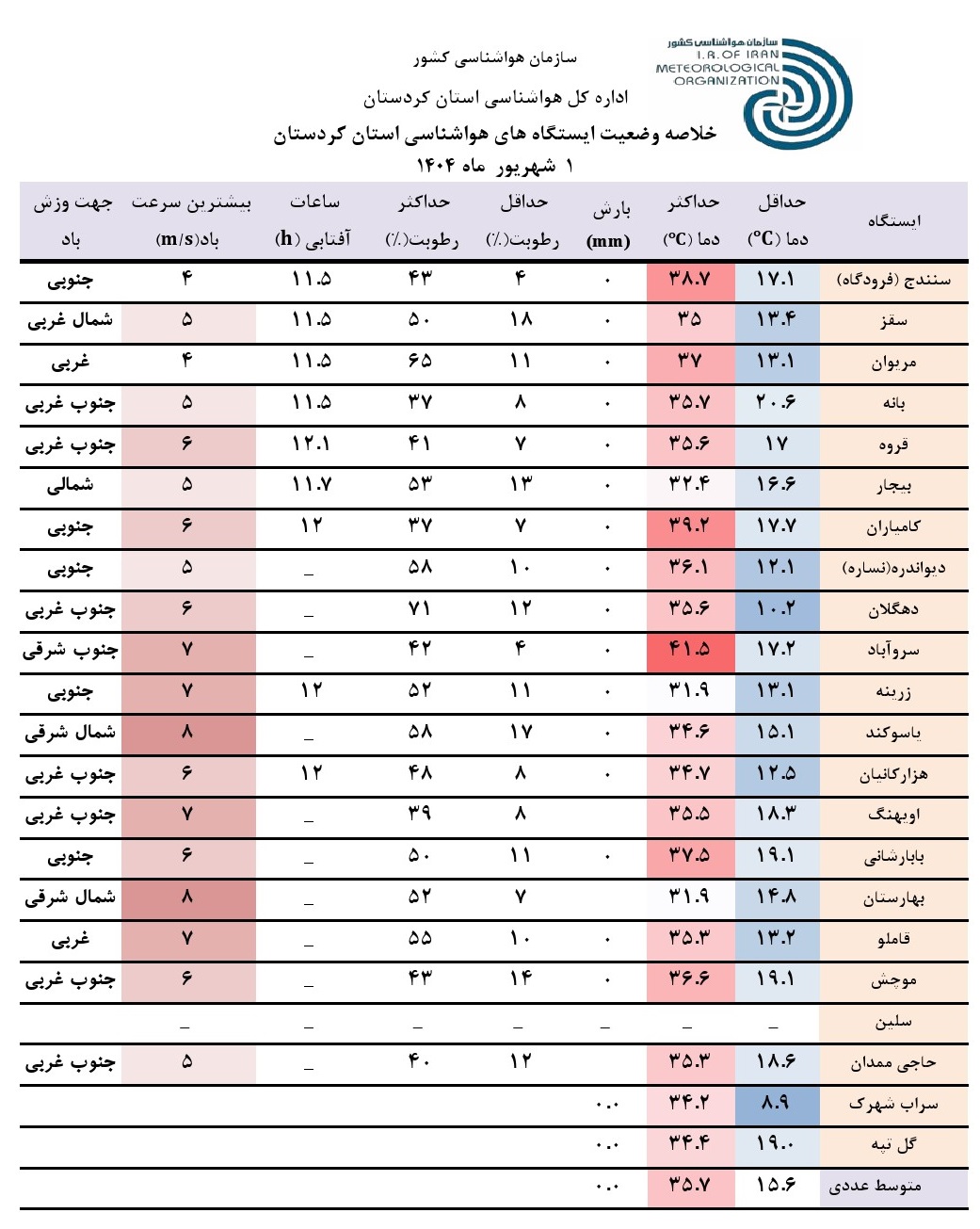 خلاصه وضعیت ایستگاه های هواشناسی استان کردستان در 24 ساعت گذشته؛ تاریخ صدور: شنبه 1 شهریور ماه 1404