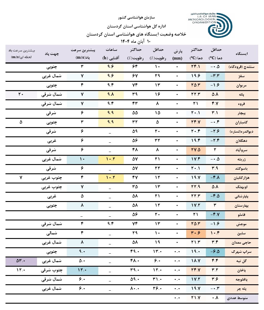 خلاصه وضعیت ایستگاه های هواشناسی استان کردستان در 24 ساعت گذشته؛ تاریخ صدور: شنبه 10 آبان ماه 1404