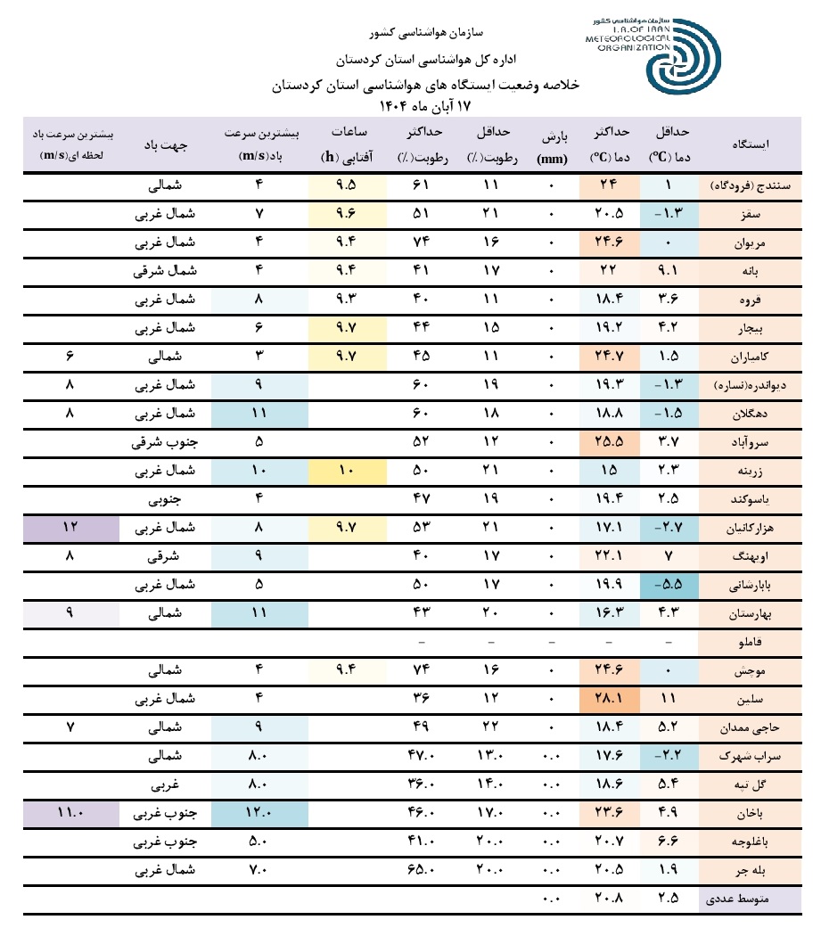 خلاصه وضعیت ایستگاه های هواشناسی استان کردستان در 24 ساعت گذشته؛ تاریخ صدور: شنبه 17 آبان ماه 1404