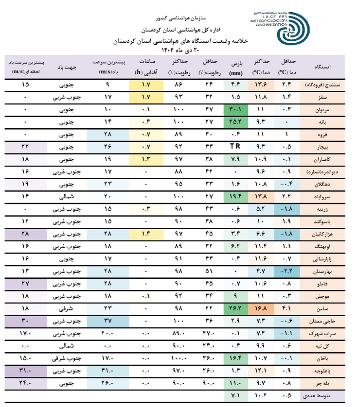 خلاصه وضعیت ایستگاه های هواشناسی استان کردستان در 24 ساعت گذشته؛ تاریخ صدور: شنبه 20 دی ماه 1404