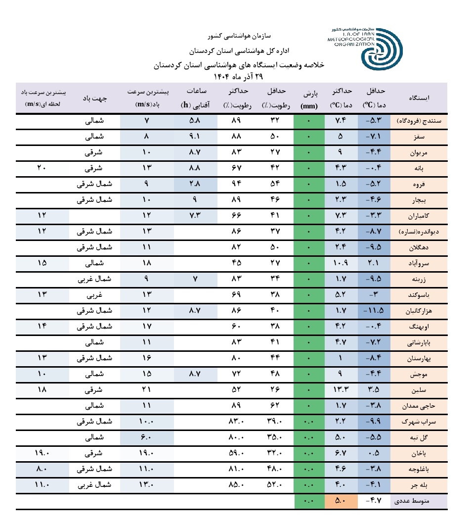 خلاصه وضعیت ایستگاه های هواشناسی استان کردستان در 24 ساعت گذشته؛ تاریخ صدور: شنبه 29 آذر ماه 1404