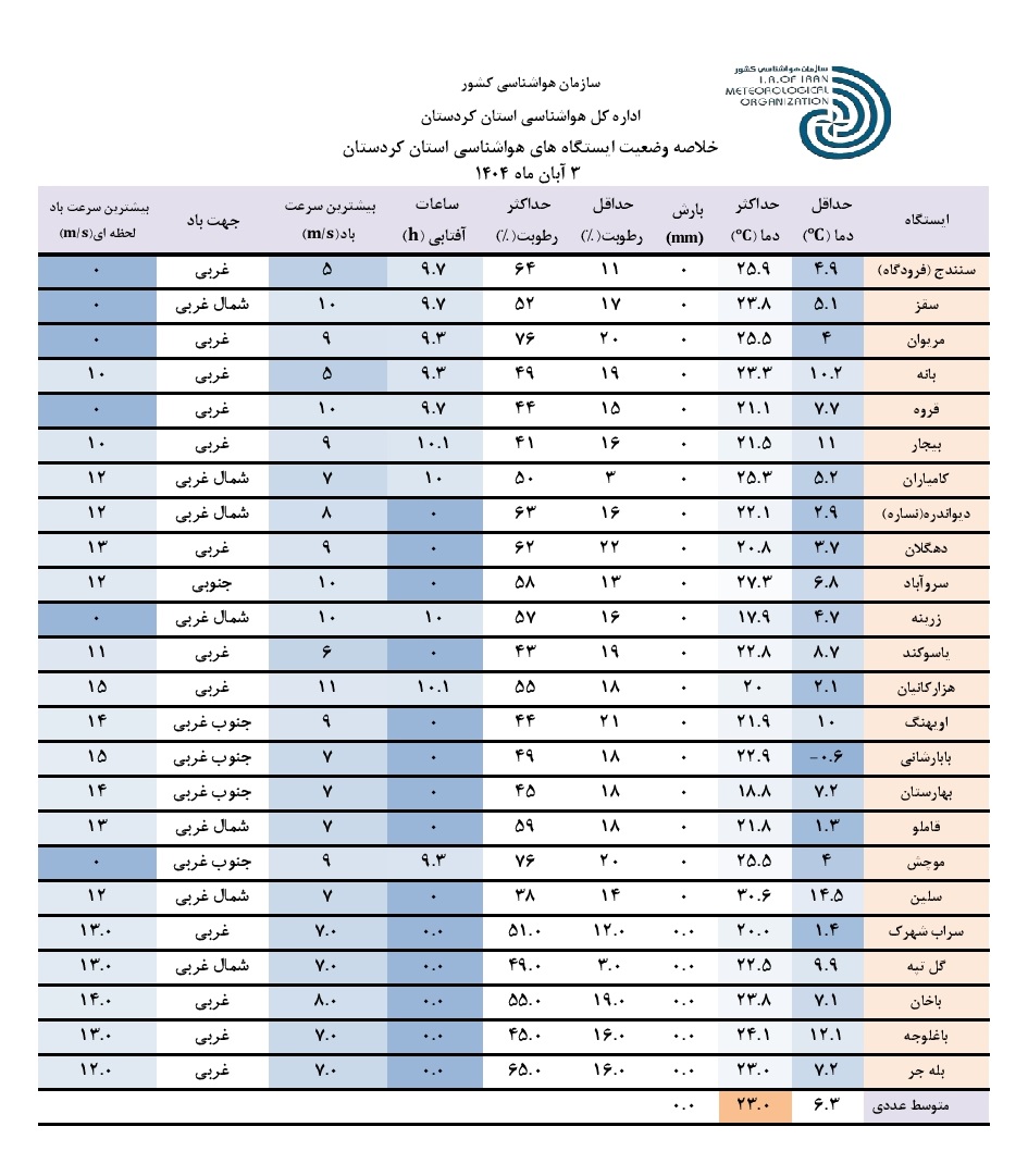 خلاصه وضعیت ایستگاه های هواشناسی استان کردستان در 24 ساعت گذشته؛ تاریخ صدور: شنبه 3 آبان ماه 1404