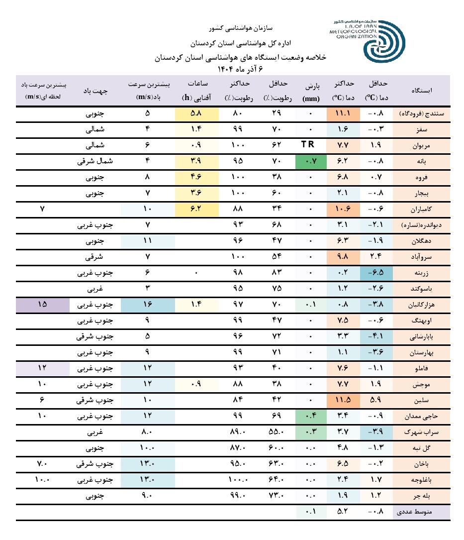 خلاصه وضعیت ایستگاه های هواشناسی استان کردستان در 24 ساعت گذشته؛ تاریخ صدور: شنبه 6 دی ماه 1404