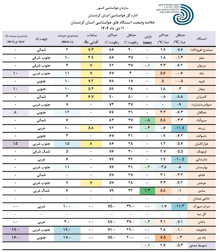 خلاصه وضعیت ایستگاه های هواشناسی استان کردستان در 24 ساعت گذشته؛ تاریخ صدور: پنجشنبه 11 دی ماه 1404