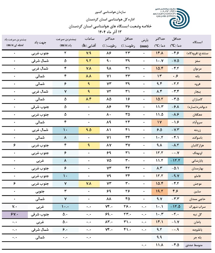 خلاصه وضعیت ایستگاه های هواشناسی استان کردستان در 24 ساعت گذشته؛ تاریخ صدور: پنجشنبه 13 آذر ماه 1404