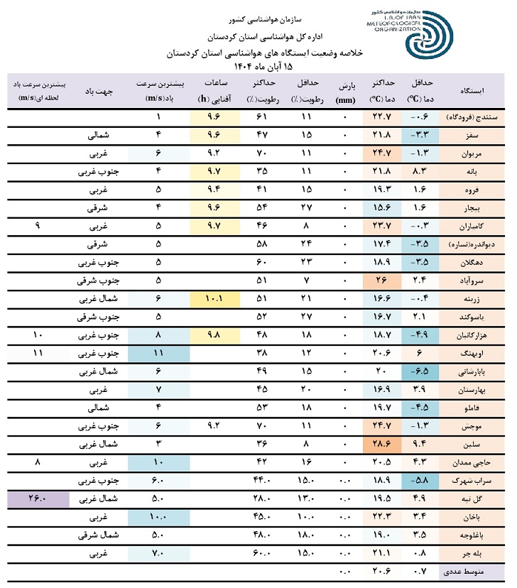 خلاصه وضعیت ایستگاه های هواشناسی استان کردستان در 24 ساعت گذشته؛ تاریخ صدور: پنجشنبه 15 آبان ماه 1404
