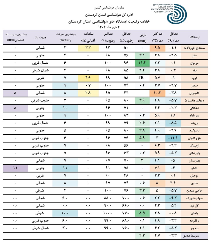 خلاصه وضعیت ایستگاه های هواشناسی استان کردستان در 24 ساعت گذشته؛ تاریخ صدور: پنجشنبه 4 دی ماه 1404