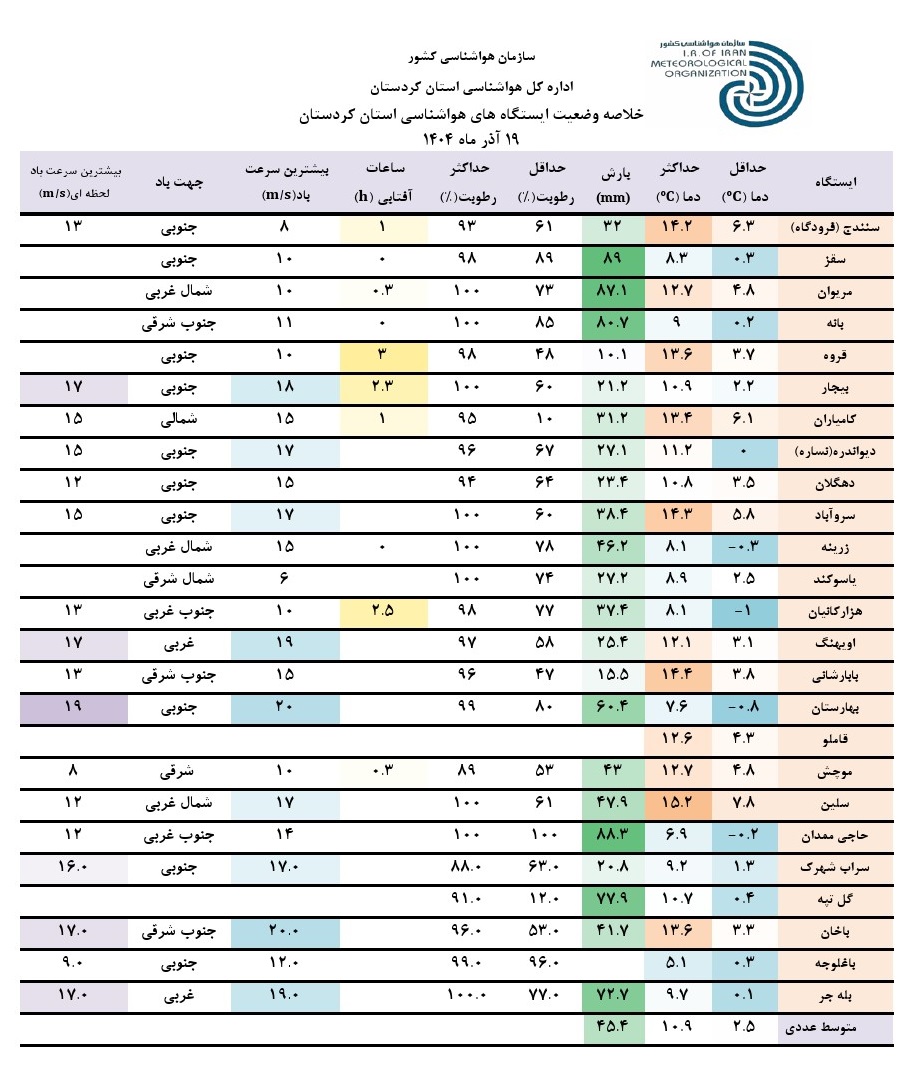 خلاصه وضعیت ایستگاه های هواشناسی استان کردستان در 24 ساعت گذشته؛ تاریخ صدور: چهارشنبه 19 آذر ماه 1404