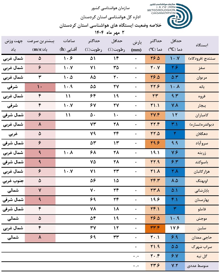 خلاصه وضعیت ایستگاه های هواشناسی استان کردستان در 24 ساعت گذشته؛ تاریخ صدور: چهارشنبه 2 مهر ماه 1404