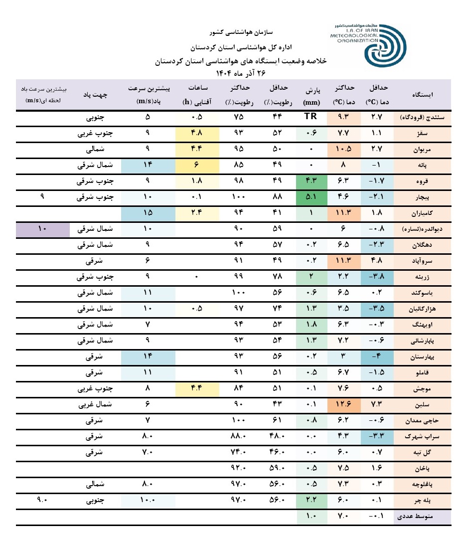 خلاصه وضعیت ایستگاه های هواشناسی استان کردستان در 24 ساعت گذشته؛ تاریخ صدور: چهارشنبه 26 آذر ماه 1404