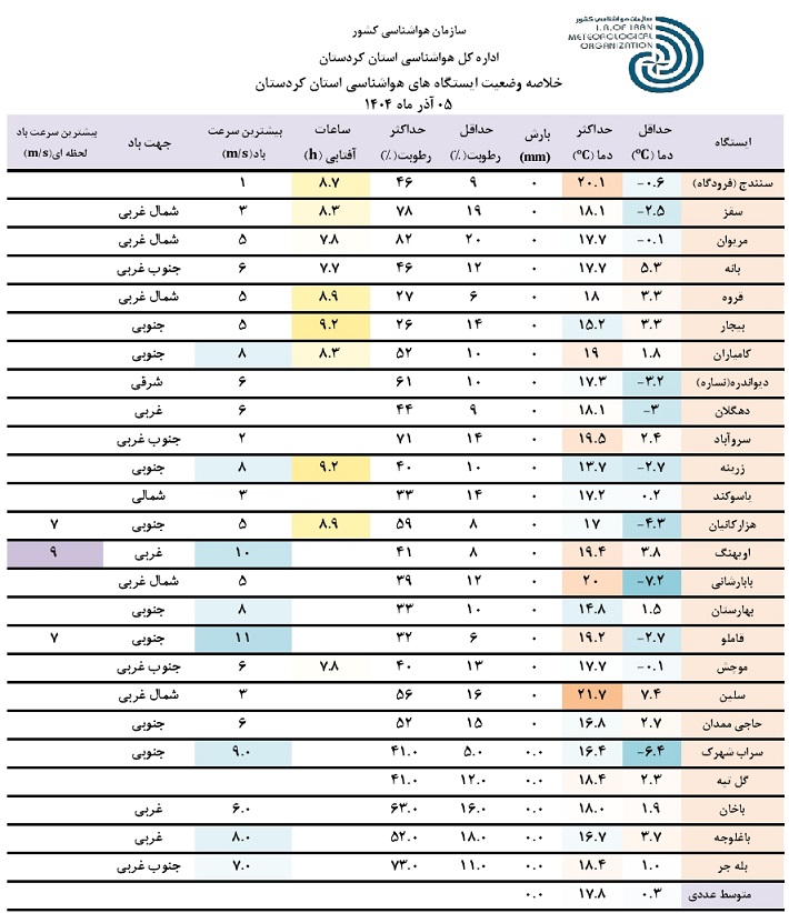 خلاصه وضعیت ایستگاه های هواشناسی استان کردستان در 24 ساعت گذشته؛ تاریخ صدور: چهارشنبه 5 آذر ماه 1404