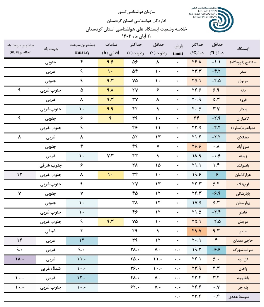 خلاصه وضعیت ایستگاه های هواشناسی استان کردستان در 24 ساعت گذشته؛ تاریخ صدور: یکشنبه 11 آبان ماه 1404
