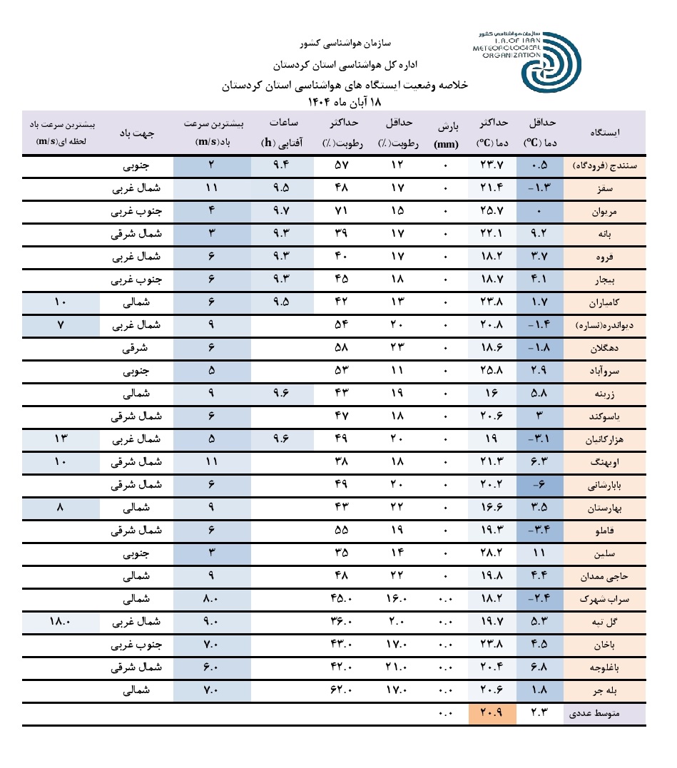 خلاصه وضعیت ایستگاه های هواشناسی استان کردستان در 24 ساعت گذشته؛ تاریخ صدور: یکشنبه 18 آبان ماه 1404