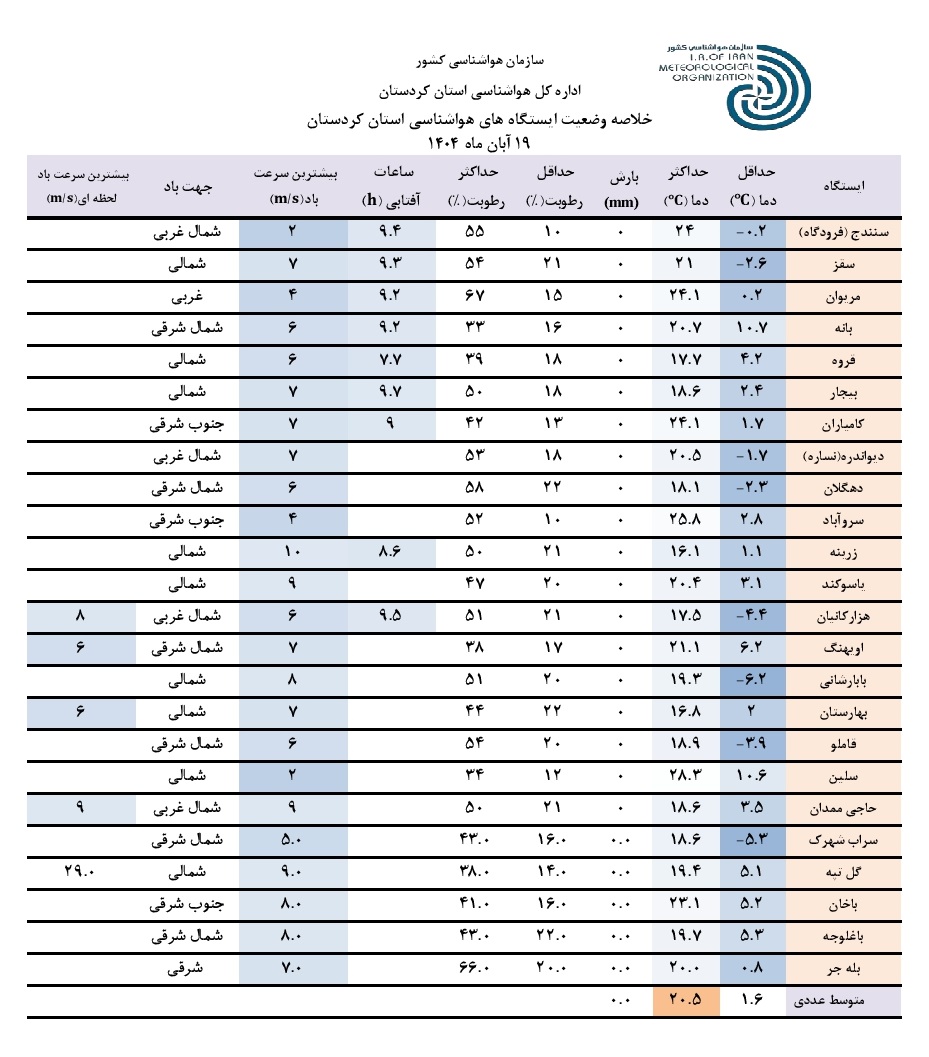 خلاصه وضعیت ایستگاه های هواشناسی استان کردستان در 24 ساعت گذشته؛ تاریخ صدور: دوشنبه 19 آبان ماه 1404