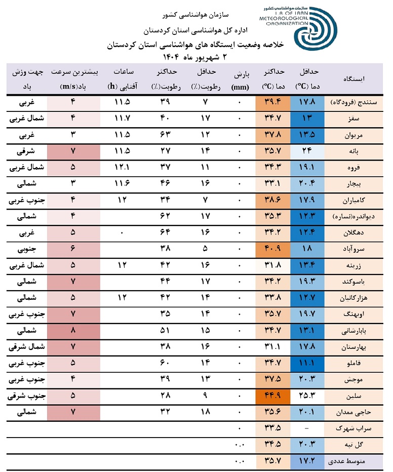 خلاصه وضعیت ایستگاه های هواشناسی استان کردستان در 24 ساعت گذشته؛ تاریخ صدور: یکشنبه 2 شهریور ماه 1404