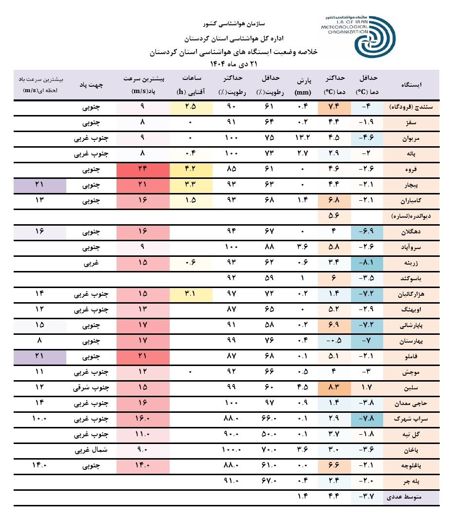 خلاصه وضعیت ایستگاه های هواشناسی استان کردستان در 24 ساعت گذشته؛ تاریخ صدور: یکشنبه 21 دی ماه 1404