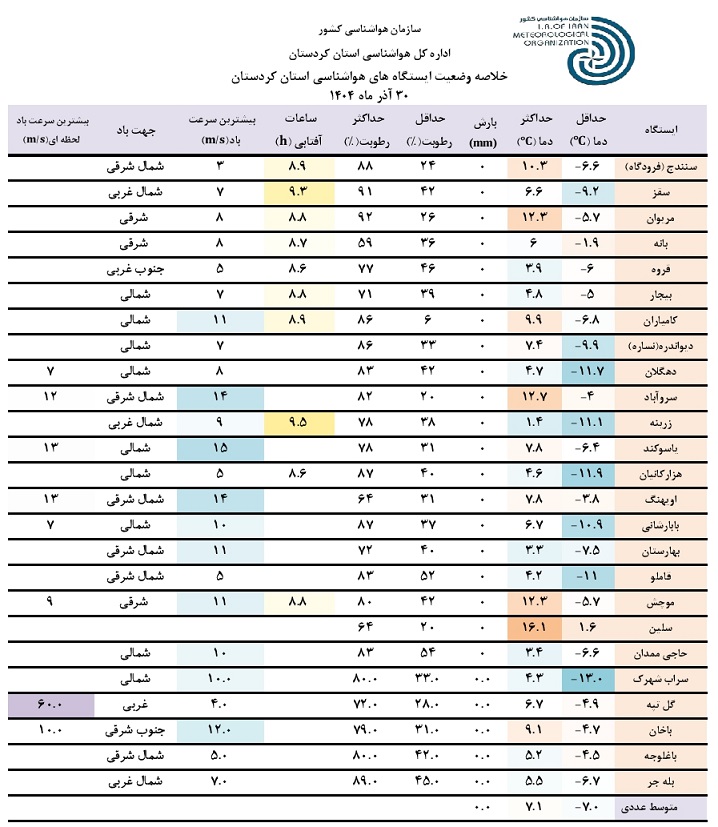 خلاصه وضعیت ایستگاه های هواشناسی استان کردستان در 24 ساعت گذشته؛ تاریخ صدور: یکشنبه 30 آذر ماه 1404
