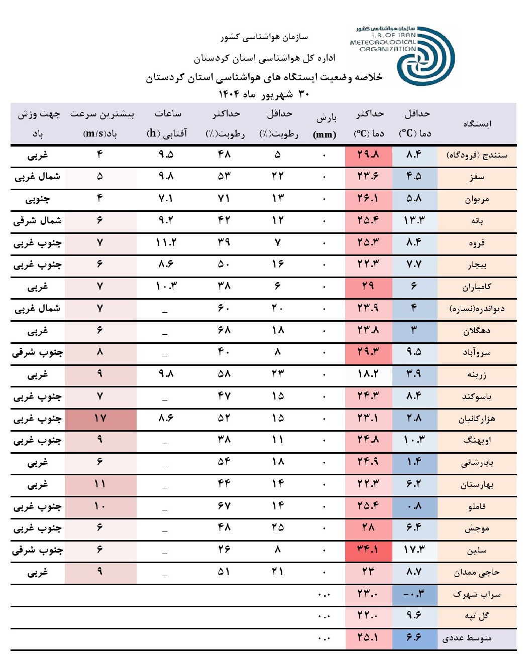 خلاصه وضعیت ایستگاه های هواشناسی استان کردستان در 24 ساعت گذشته؛ تاریخ صدور: یکشنبه 30 شهریور ماه 1404