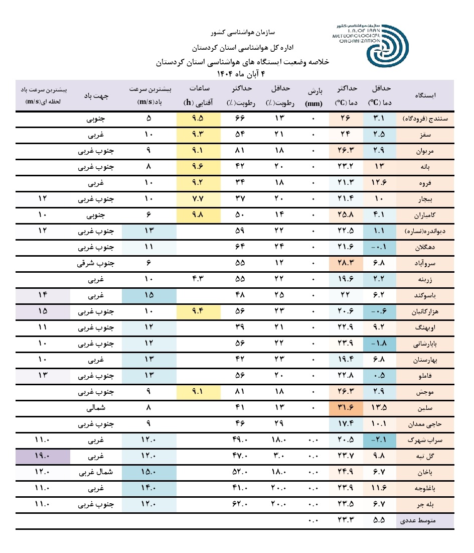 خلاصه وضعیت ایستگاه های هواشناسی استان کردستان در 24 ساعت گذشته؛ تاریخ صدور: یکشنبه 4 آبان ماه 1404
