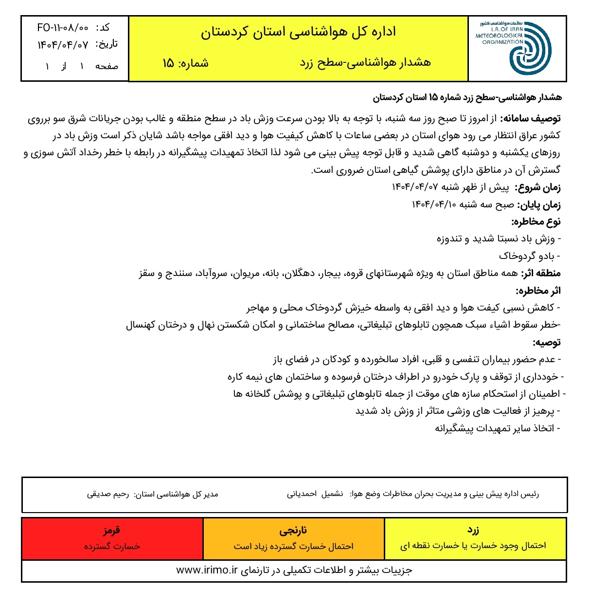 هشدار سطح زرد شماره 15، وزش باد شدید و نفوذ گرد و خاک به استان؛ تاریخ صدور: شنبه 7 تیر ماه 1404