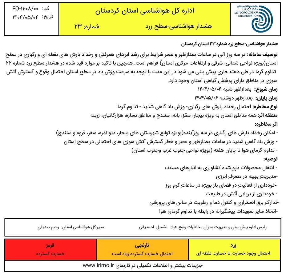 هشدار سطح زرد شماره 23- رگبار و رعد وبرق پراکنده، تداوم گرما؛ تاریخ صدور: شنبه 4 مرداد ماه 1404