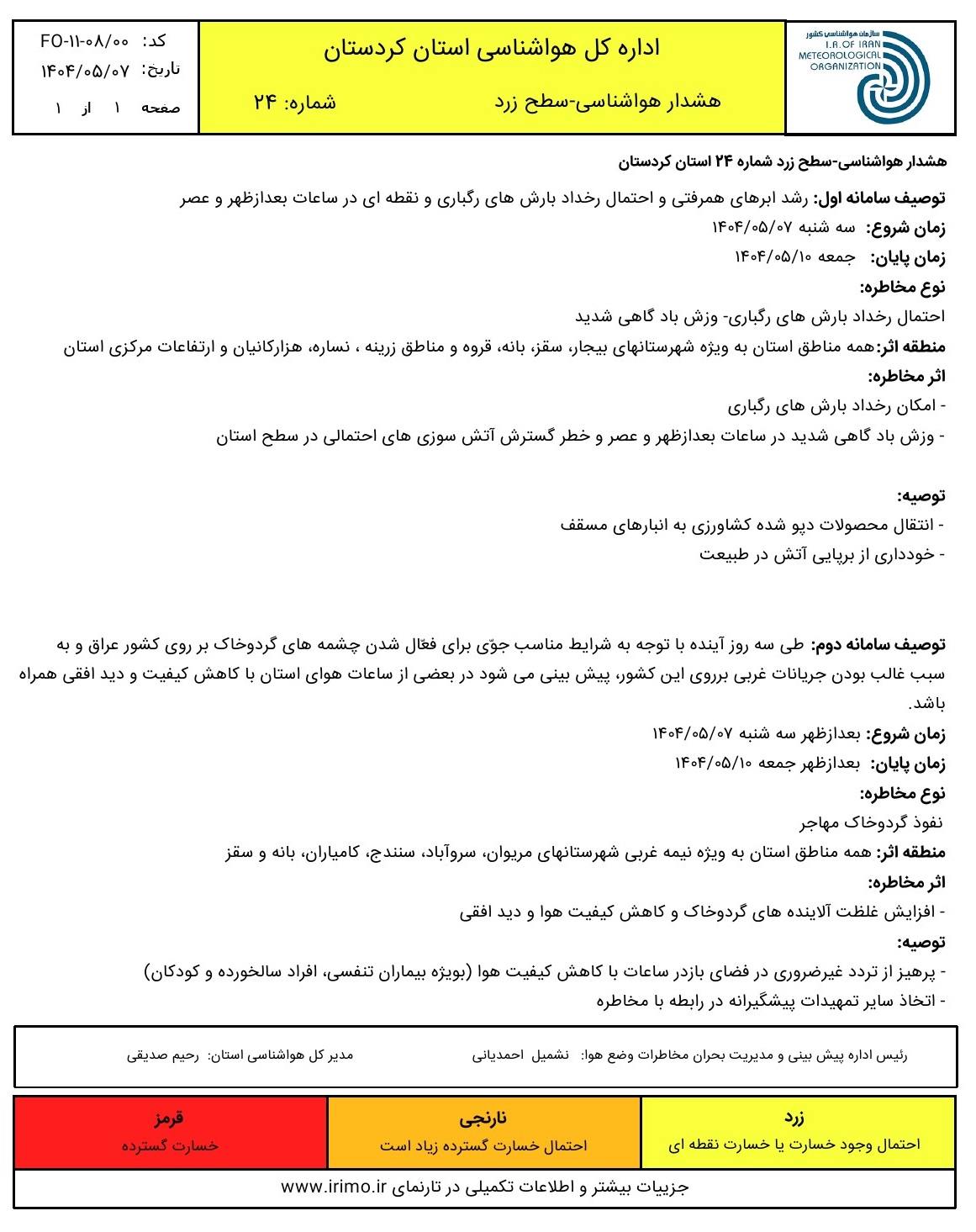 هشدار سطح زرد شماره 24 -نفوذ گردوخاک و کاهش کیفیت هوا، رشد ابرهای همرفتی و احتمال رخداد بارش های رگباری. تاریخ صدور: سه شنبه 7 مرداد ماه 1404