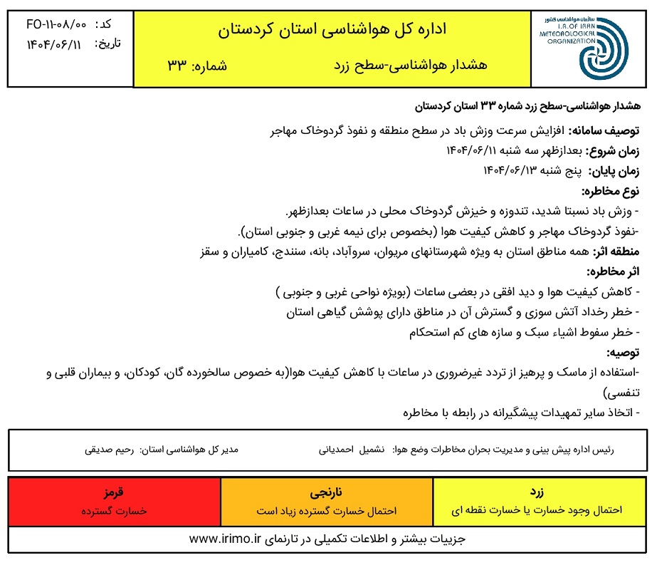 هشدار سطح زرد شماره 33- وزش باد گاهی شدید و نفوذ گرد و خاک مهاجر؛ تاریخ صدور: سه شنبه 11 شهریور ماه 1404