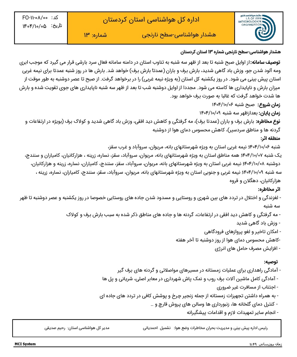 هشدار سطح نارنجی شماره 13: بارش برف و باران (عمدتا برف)، وزش باد شدید و مه گرفتگی؛ تاریخ صدور: جمعه 5 دی ماه 1404