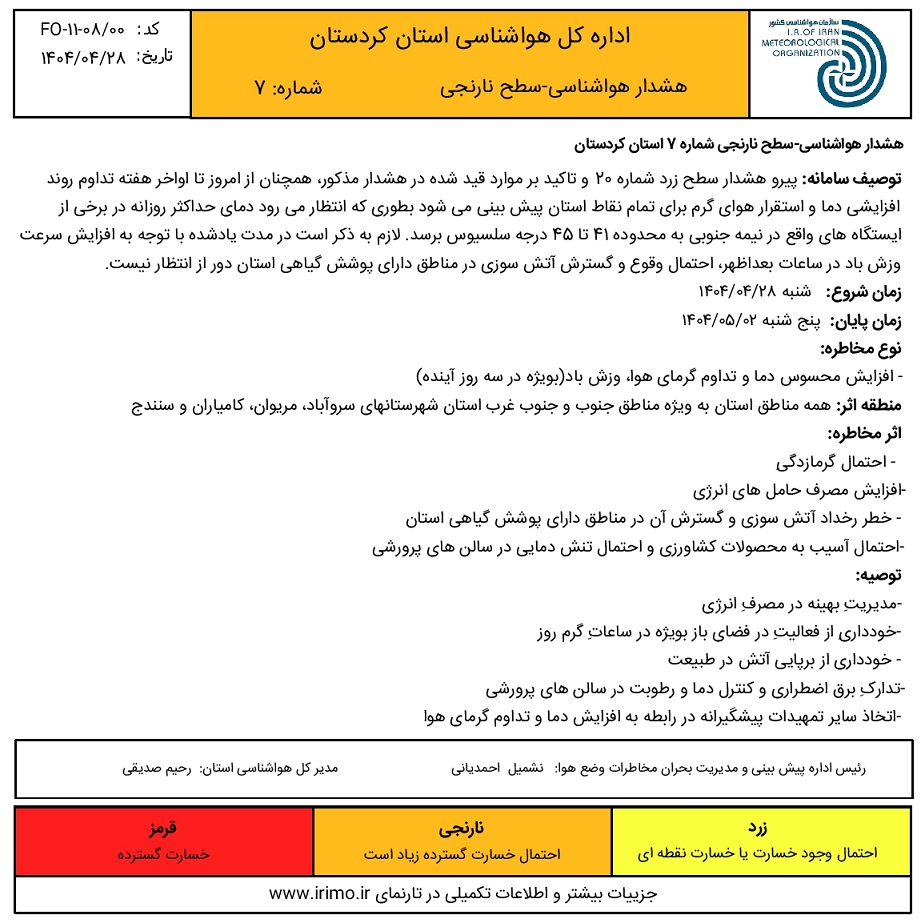 هشدار سطح نارنجی شماره 7، افزایش محسوس دما و تداوم گرما؛ تاریخ صدور: شنبه 28 تیر ماه 1404