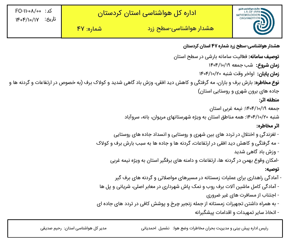 هشدار هواشناسی سطح زرد شماره 47 - فعالیت سامانه بارشی. زمان صدور: چهارشنبه 17 دی ماه 1404