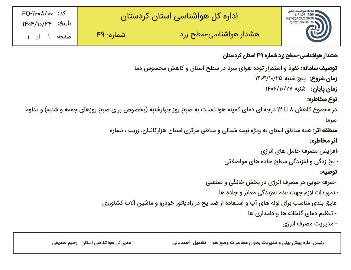 هشدار هواشناسی سطح زرد شماره 49- نفوذ توده هوای سرد و کاهش محسوس دما، زمان صدور: چهارشنبه 24 دی ماه 1404