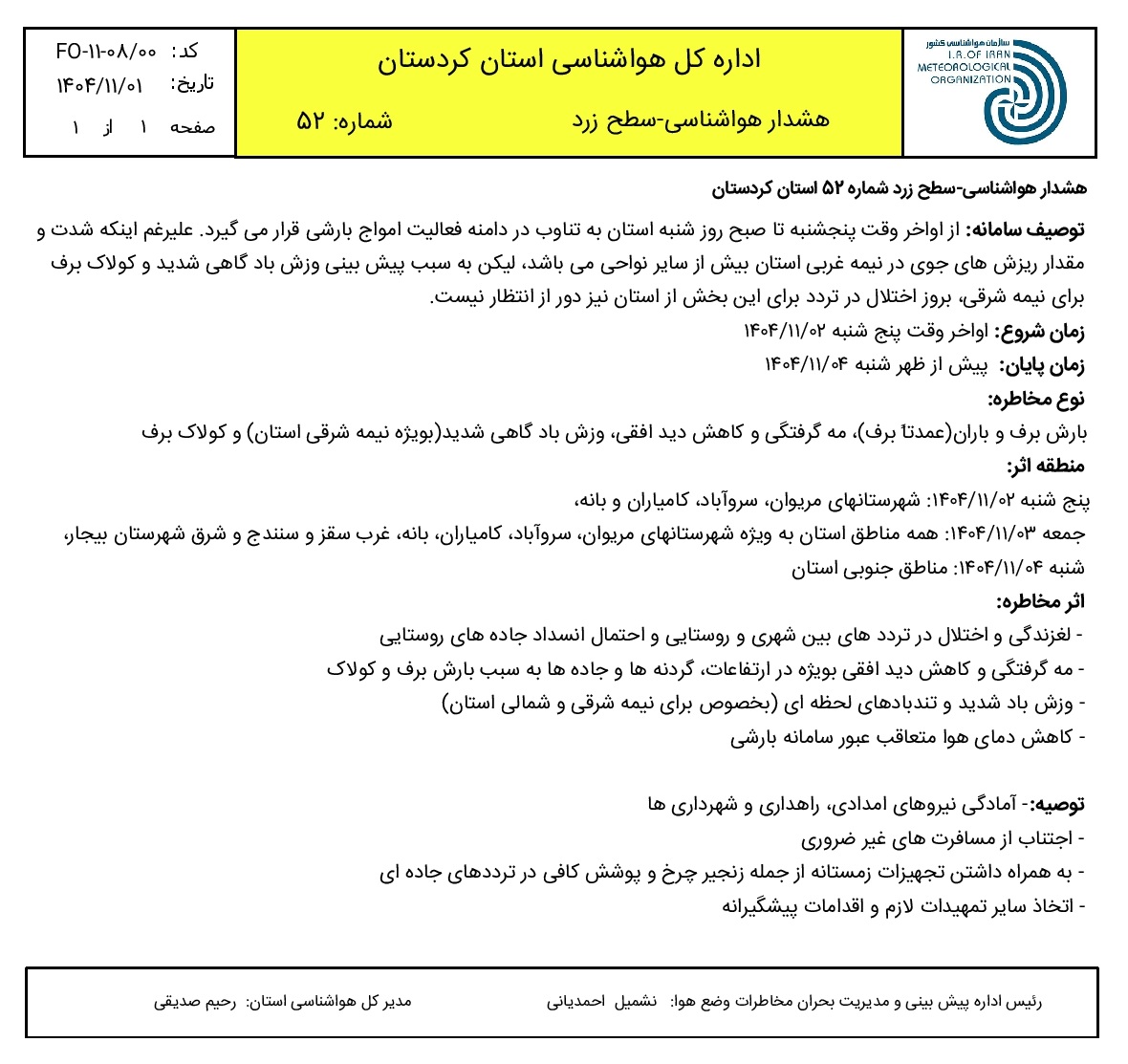 هشدار هواشناسی سطح زرد شماره 52- فعالیت سامانه بارشی، زمان صدور: چهارشنبه 1 بهمن ماه 1404