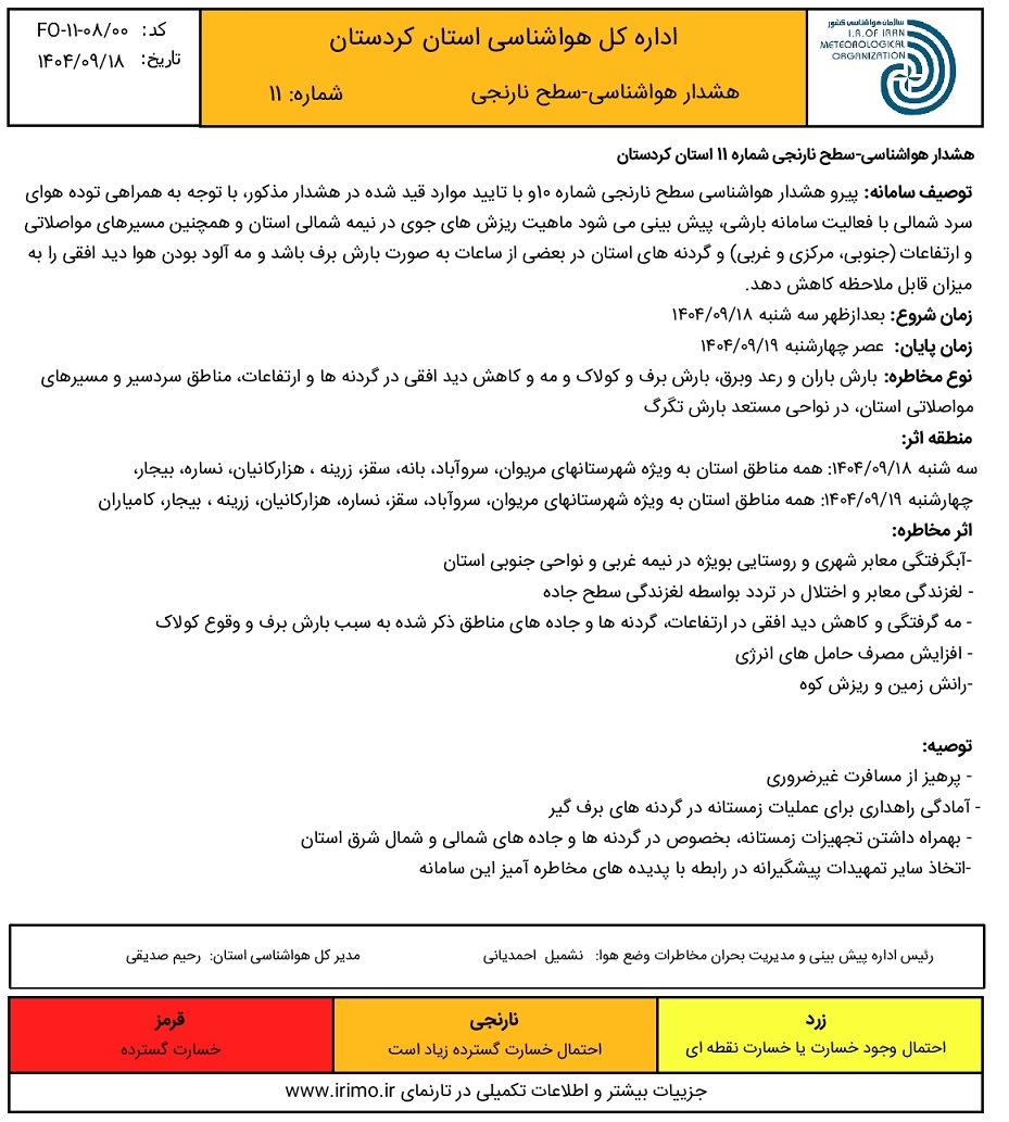 هشدار هواشناسی سطح نارنجی شماره 11 -رگبار برف، مه و کاهش دید افقی در ادامه فعالیت سیستم بارشی، تاریخ صدور: سه شنبه 18 آذر ماه 1404