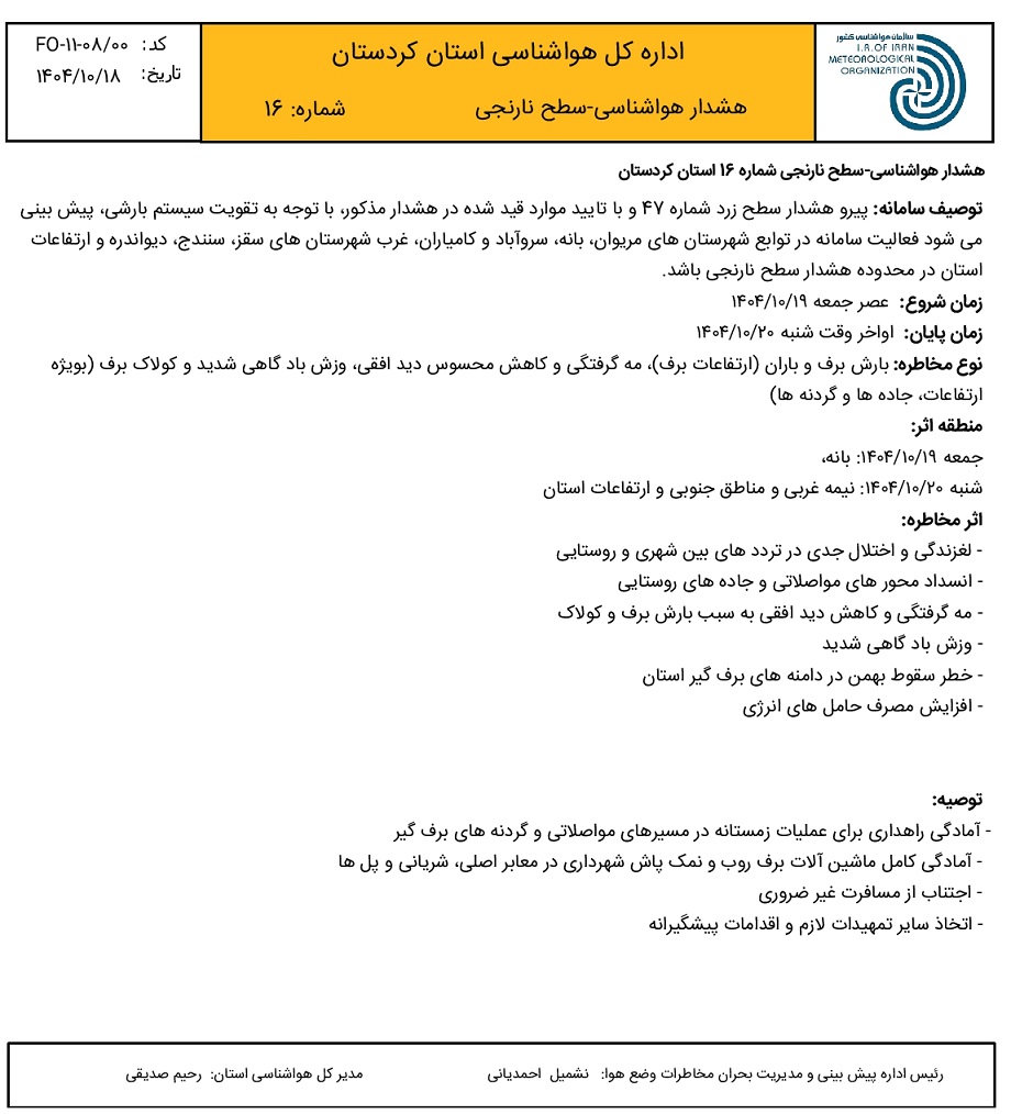 هشدار هواشناسی سطح نارنجی شماره 16- فعالیت سامانه بارشی. زمان صدور: پنجشنبه 18 دی ماه 1404