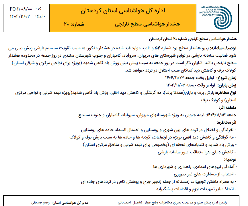 هشدار هواشناسی سطح نارنجی شماره 20- تشدید فعالیت سامانه بارشی عمدتاً در جنوب غرب استان، زمان صدور: پنجشنبه 2 بهمن ماه 1404