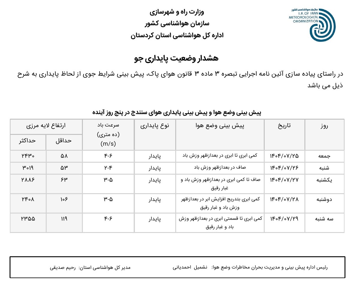 بولتن آلودگی استان کردستان؛ تاریخ صدور : جمعه 25 مهر ماه 1404