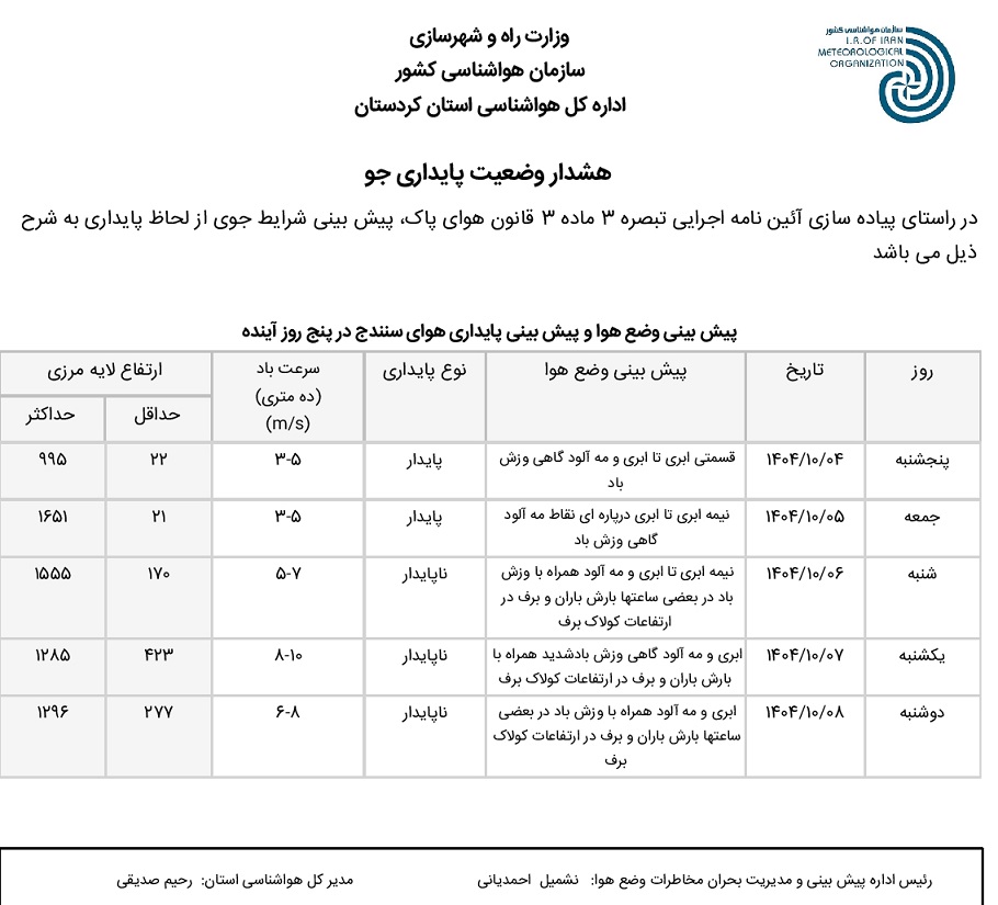 بولتن آلودگی استان کردستان؛ تاریخ صدور : جمعه 5 دی ماه 1404