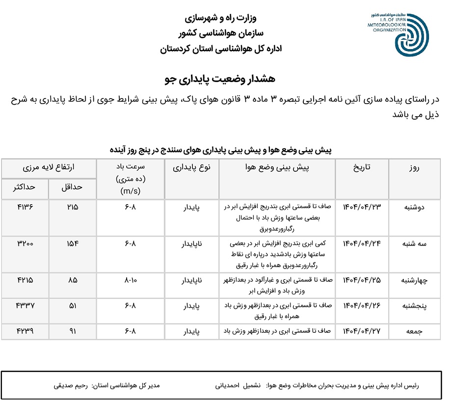 بولتن آلودگی استان کردستان؛ تاریخ صدور: دوشنبه 23 تیر ماه 1404
