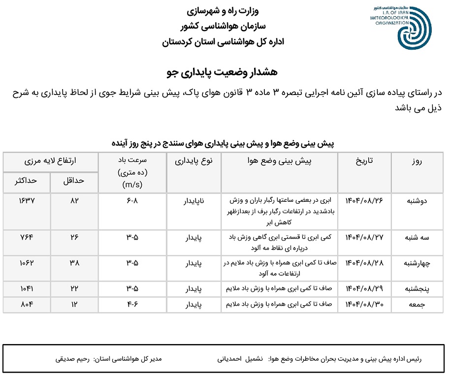 بولتن آلودگی استان کردستان؛ تاریخ صدور : دوشنبه 26 آبان ماه 1404