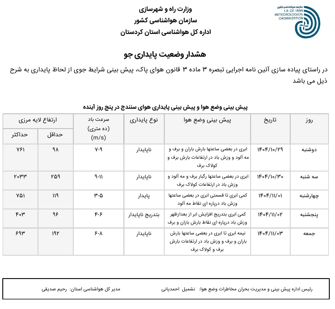 بولتن آلودگی استان کردستان؛ تاریخ صدور : دوشنبه 29 دی ماه 1404
