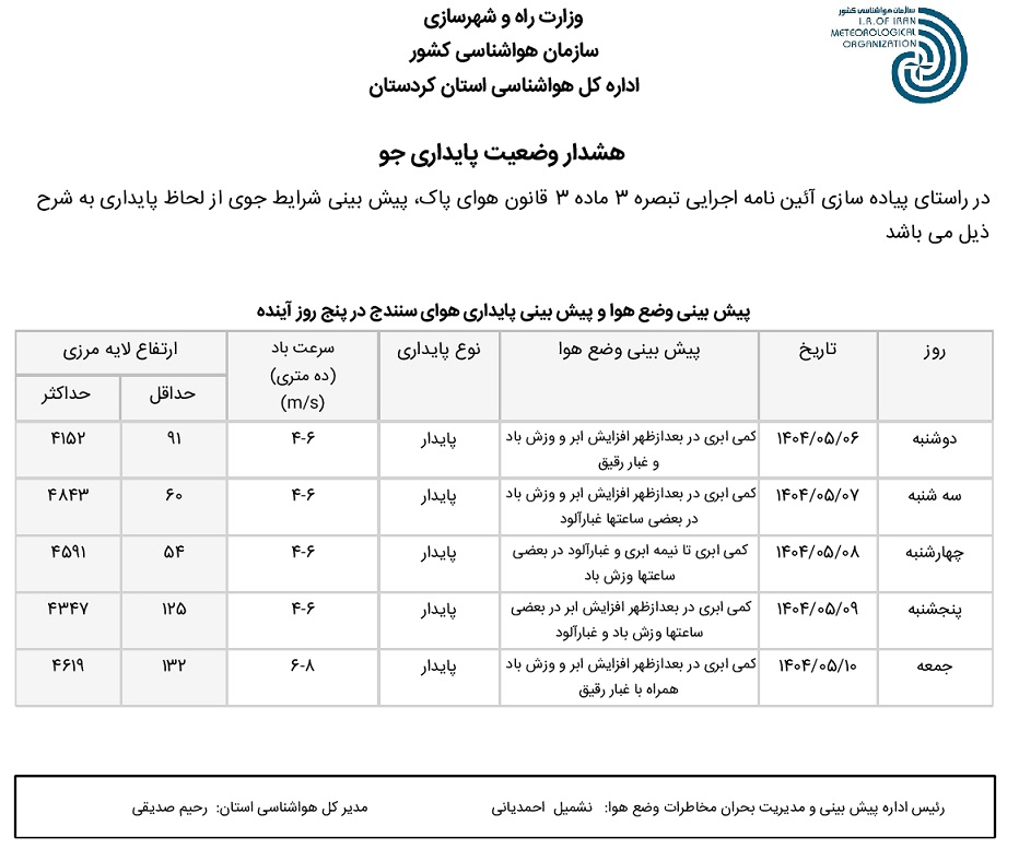 بولتن آلودگی استان کردستان؛ تاریخ صدور: دوشنبه 6 مرداد ماه 1404