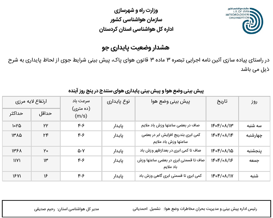 بولتن آلودگی استان کردستان؛ تاریخ صدور : سه شنبه 13 آبان ماه 1404