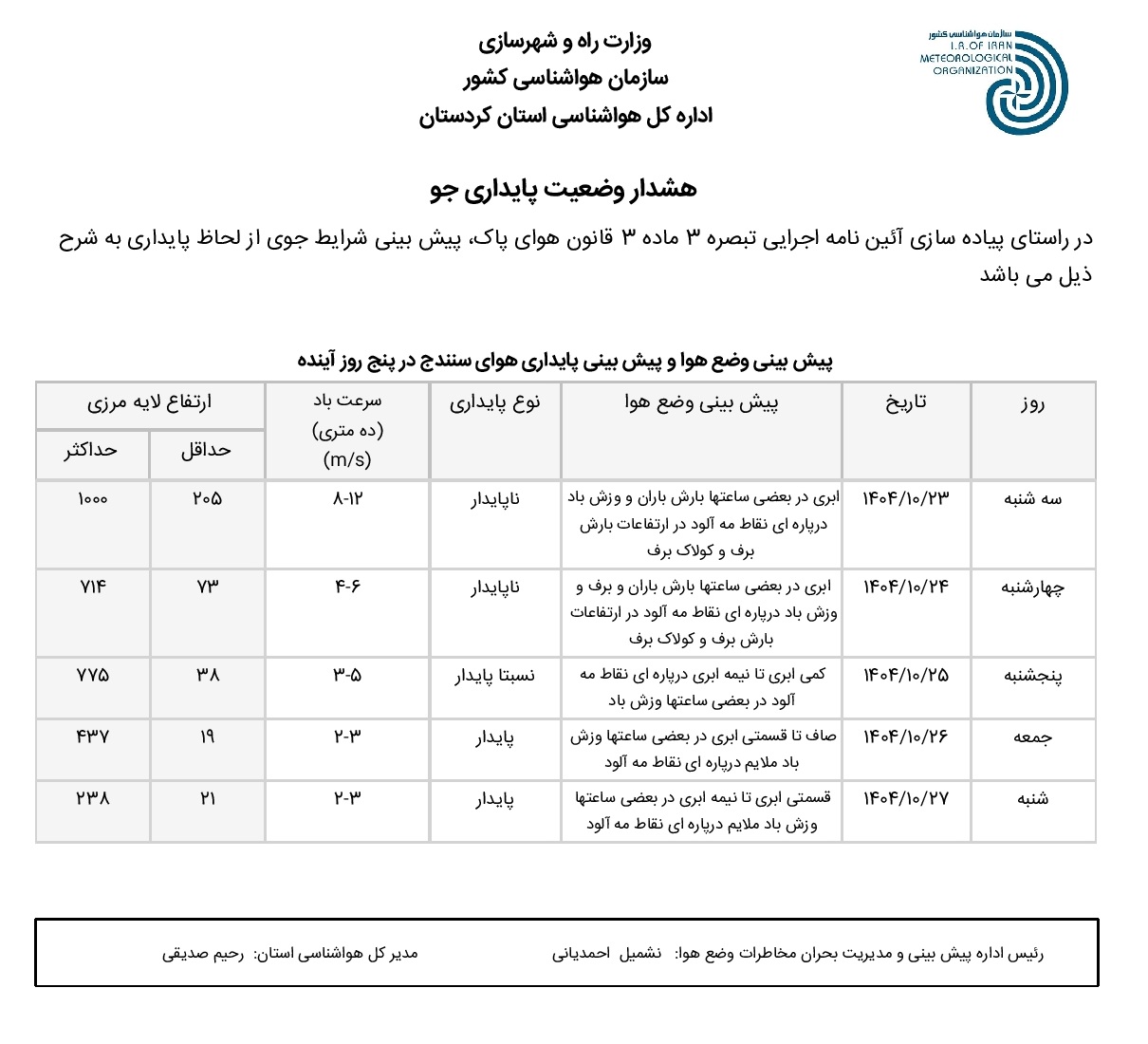 بولتن آلودگی استان کردستان؛ تاریخ صدور : سه شنبه 23 دی ماه 1404