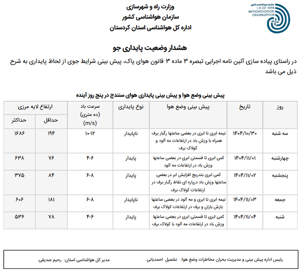 بولتن آلودگی استان کردستان؛ تاریخ صدور : سه شنبه 30 دی ماه 1404