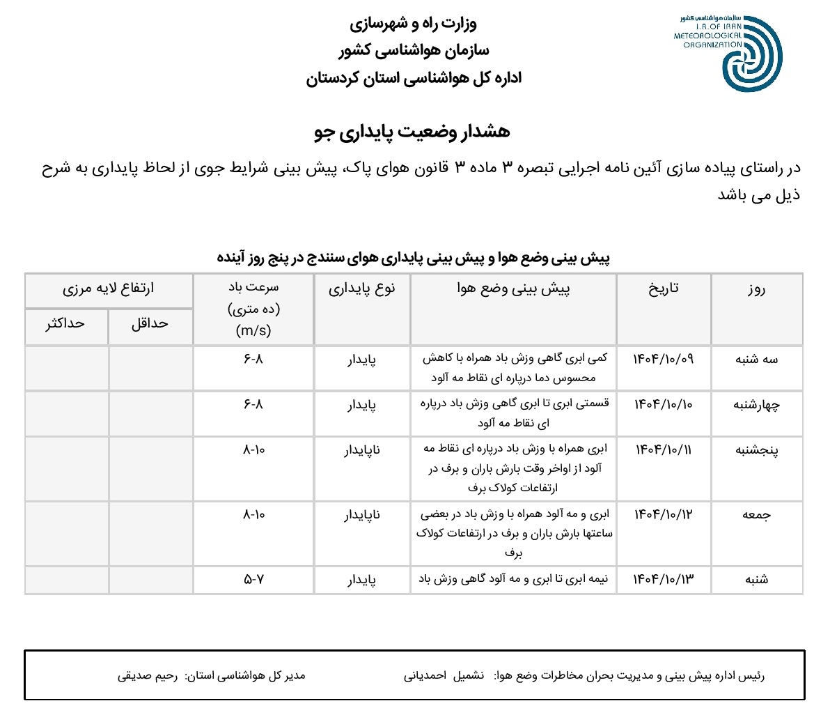 بولتن آلودگی استان کردستان؛ تاریخ صدور :سه شنبه 9 دی ماه 1404